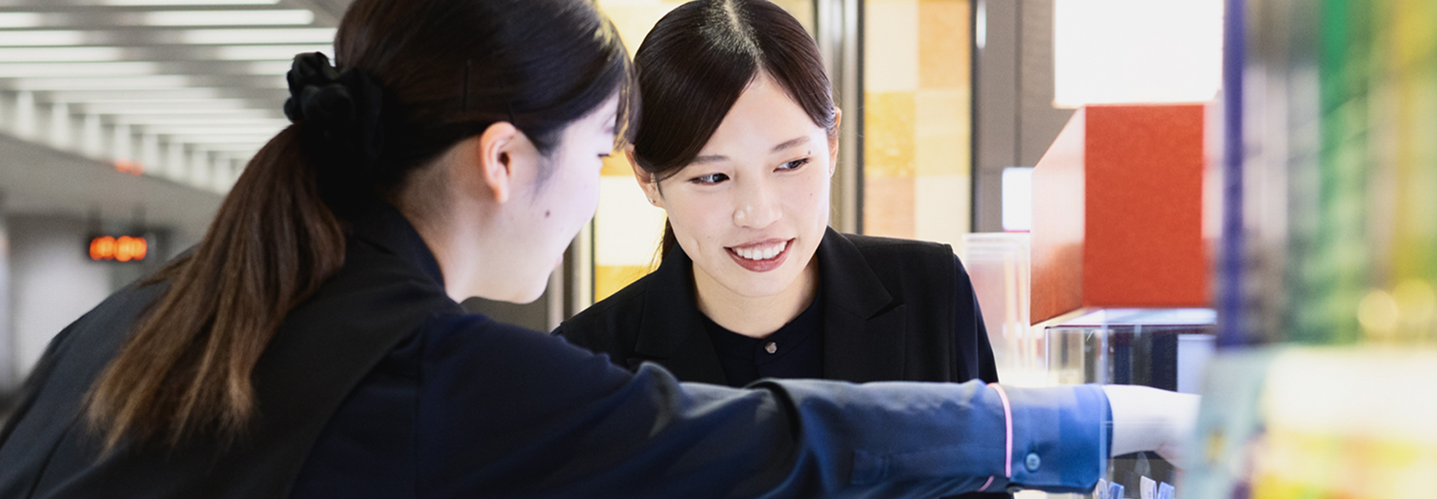 大学では英語コミュニケーション学科で学び、多様な文化に触れるなかで「国籍を越えて人と関わる仕事がしたい」という思いが生まれました。学生時代のアルバイトでも海外のお客様と接する機会が多く、その楽しさから「国際的な場所での接客ができる仕事」に強く惹かれていたんです。空港という特別な空間では、さまざまな国の方と出会えるだけでなく、日本の魅力を直接伝えることができます。